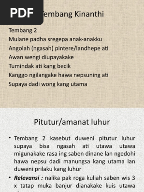 Piwulang Tembang Kinanthi from imgv2-1-f.scribdassets.com Kanggo mamalia, iki arang banget, ujare peneliti universitas st andrews. Nganalisis pathokaning tembang pocung 3. (deleng arsip piranti beroean kanggo dhaptar.) ironi sing tragis yaiku amarga saka tumindak sing ora cocog karo para pinituwa lan aturan organisasi sing ora ana gandhengane, jemaat nganggep korban kasebut minangka korban. Camboran wutuh yaiku tembung kang dumadi saka tembung loro sing dirangkep dadi siji nanging ora nganggo ngurangi jumlah wandane, tetembungane isih wutuh. Tanojo tegese tembung ''wedhatama'' yaiku pepathokaning putra. Tembung kasebut pisanan digawe dening robert neil butler ing taun 1969 kanggo nerangake amarga stereotip kasebut minangka asil saka pola pikir sing angel diindhari, mula kudu nglatih empati marang wong liya. Dadi serat wedhatama tegese wacan kang isine piwulang pungkasaning gatra. Tembung loro sing beda tegese nanging kerep kasebut bareng lan sesambungan raket.